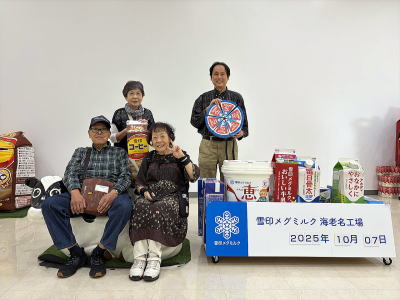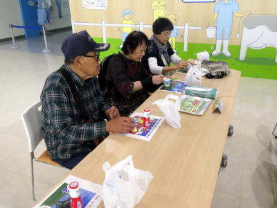 見学後、見学ホールで試食会、ヨーグルト、ヨーグルトドリンク、チーズを頂けました。また撮影スポットなどあり、みなさんいろいろ写真を撮っていました。